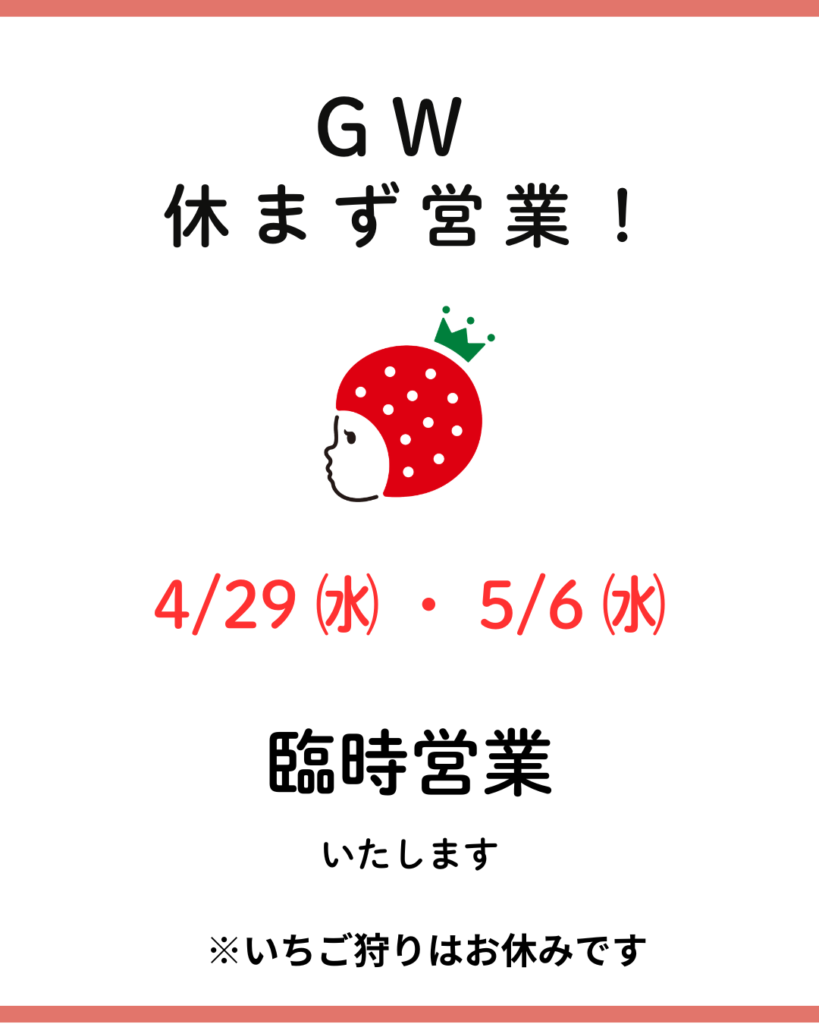 いちごの実は、おとなの腰の高さ程度なので、子供や車いすの方でも取りやすいよう工夫しています。また、栽培しているいちごの種類は固定していないので、毎年、違う種類のいちごを楽しんでいただけますよ♪